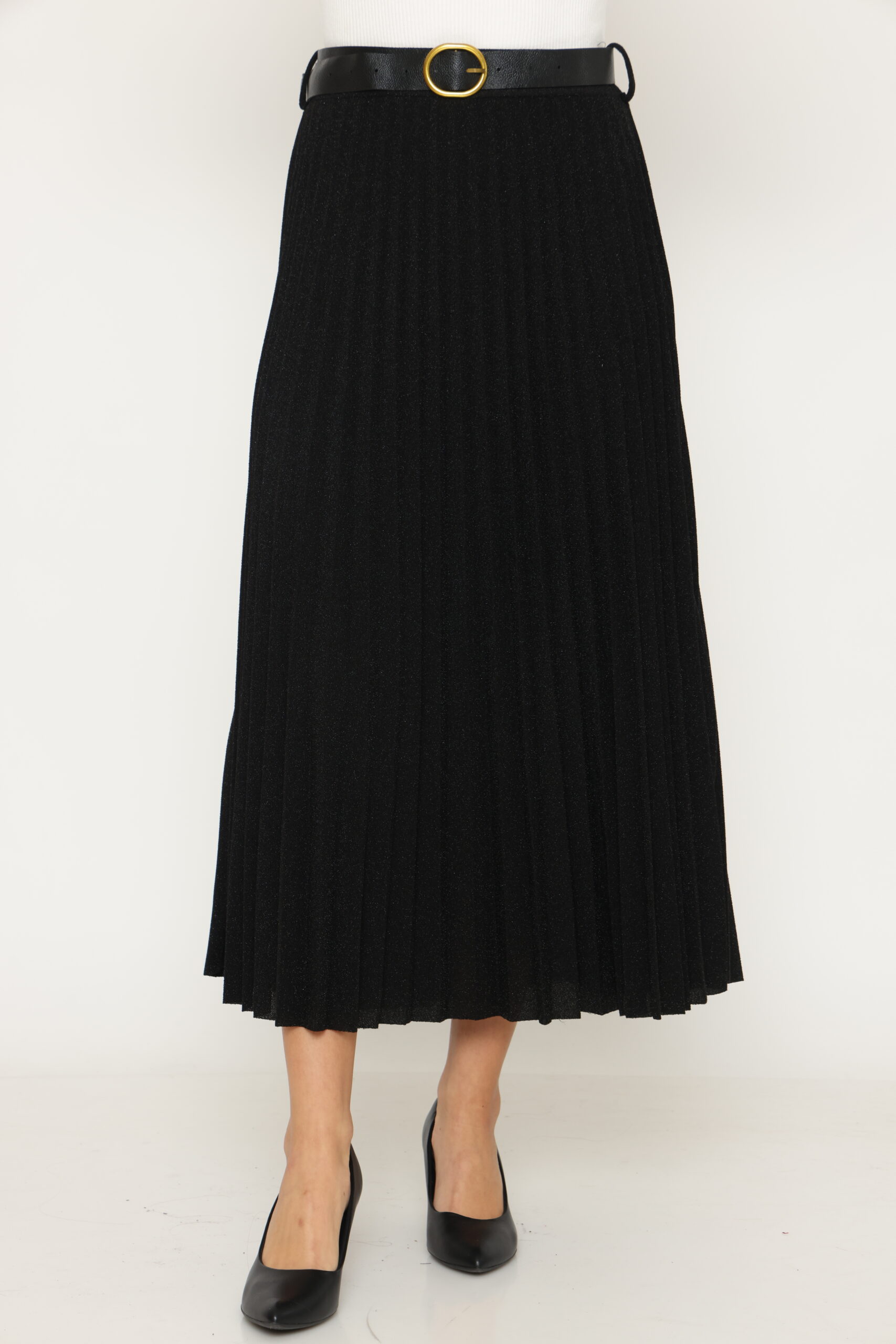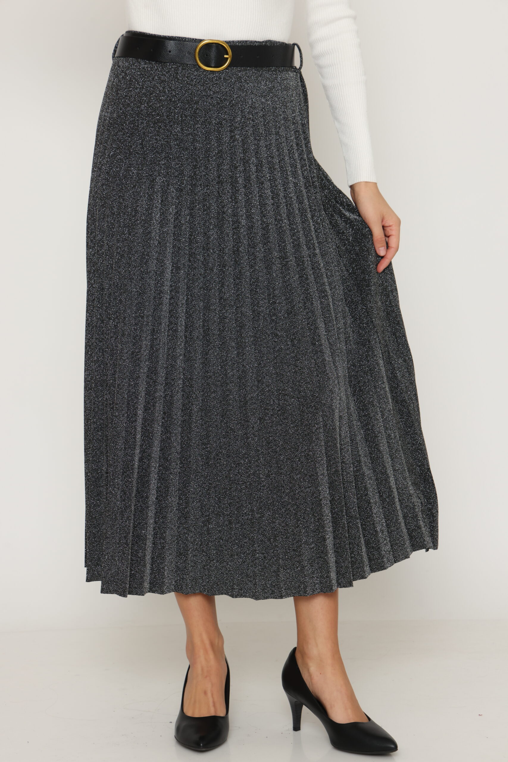 חצאית דומיניקו מבית המותג S.T ITALIA. חצאית מידי בגימור מנצנץ עם גומי במותן. מגיעה במידה וואן סייז. הרכב בד: 43% פוליאסטר, 52% מטליקה, 5% אלסטן. מידות: היקף מותן 100 ס"מ, אורך 93 ס"מ.
