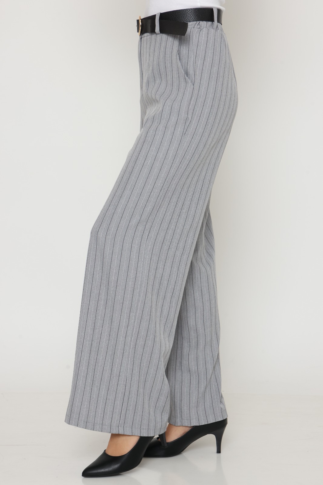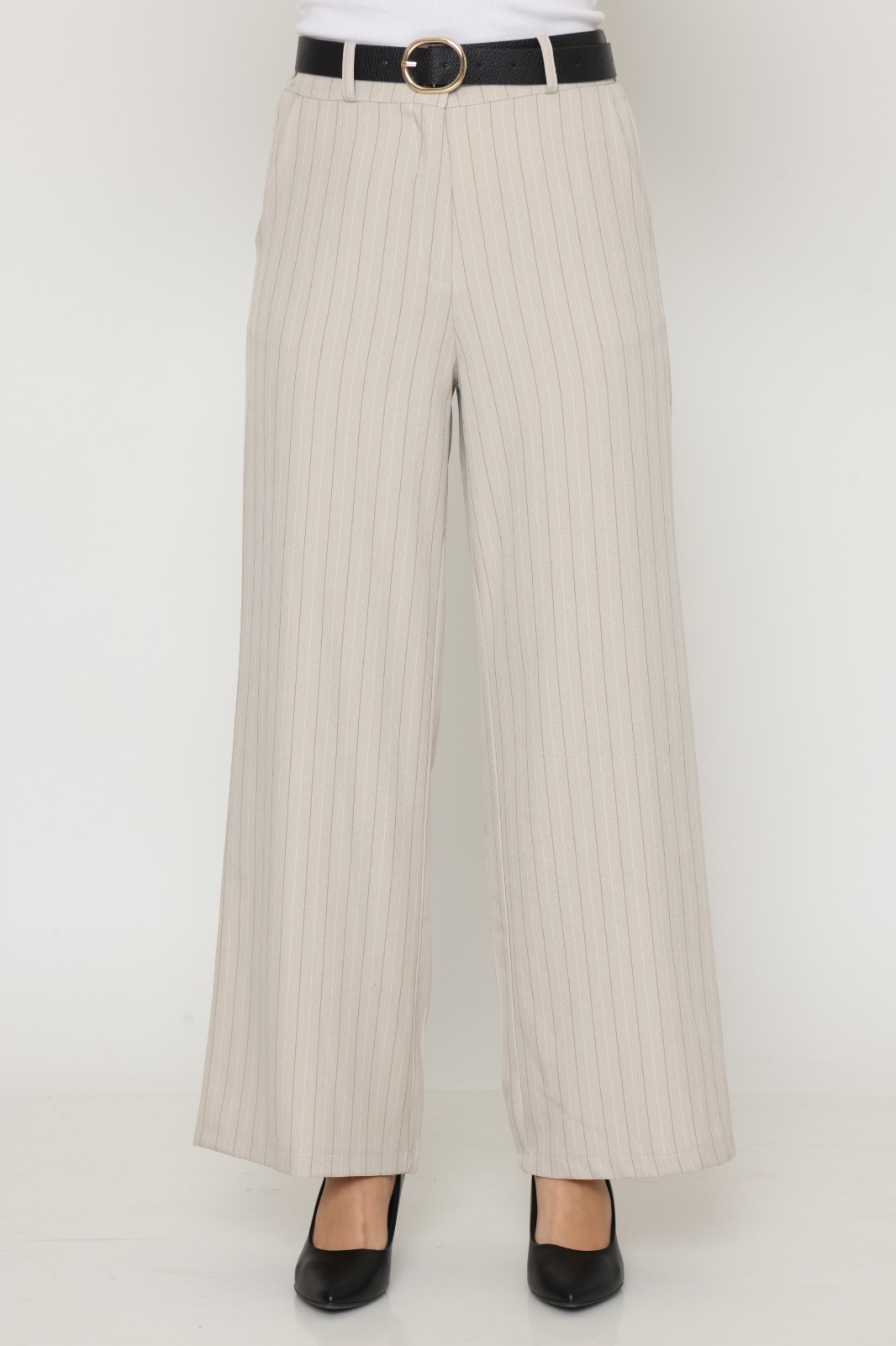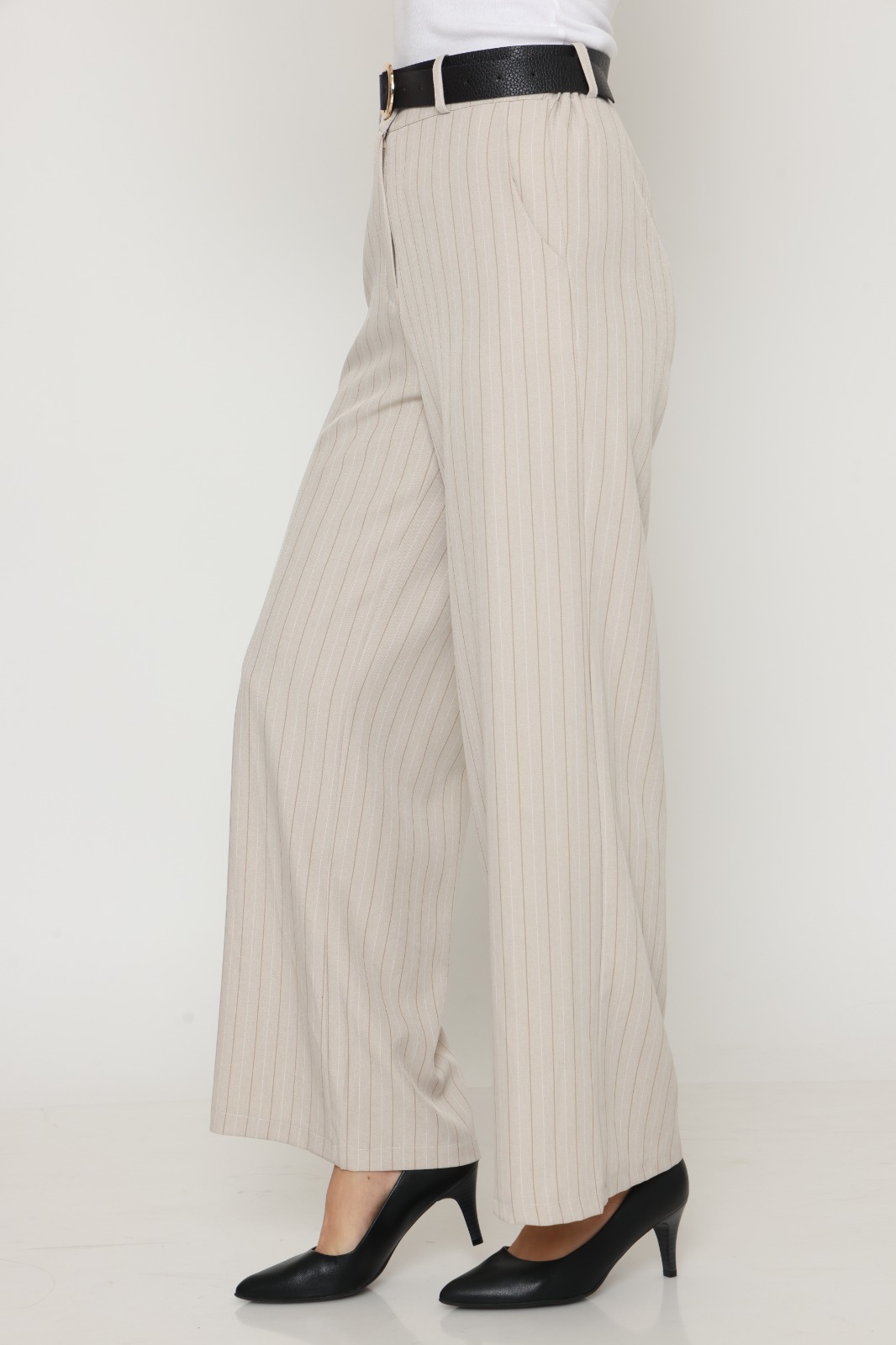 מכנס בל בגזרה ישרה, בד מחוייט בדוגמת פסים. שני כיסים קדמיים, גומי במותן האחורית וחגורה שחורה. הרכב בד: 51% ויסקוזה 46% פוליאסטר 3% אלסטן.