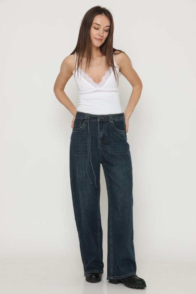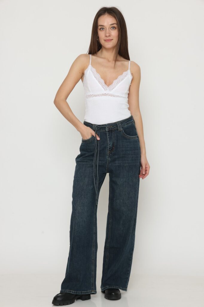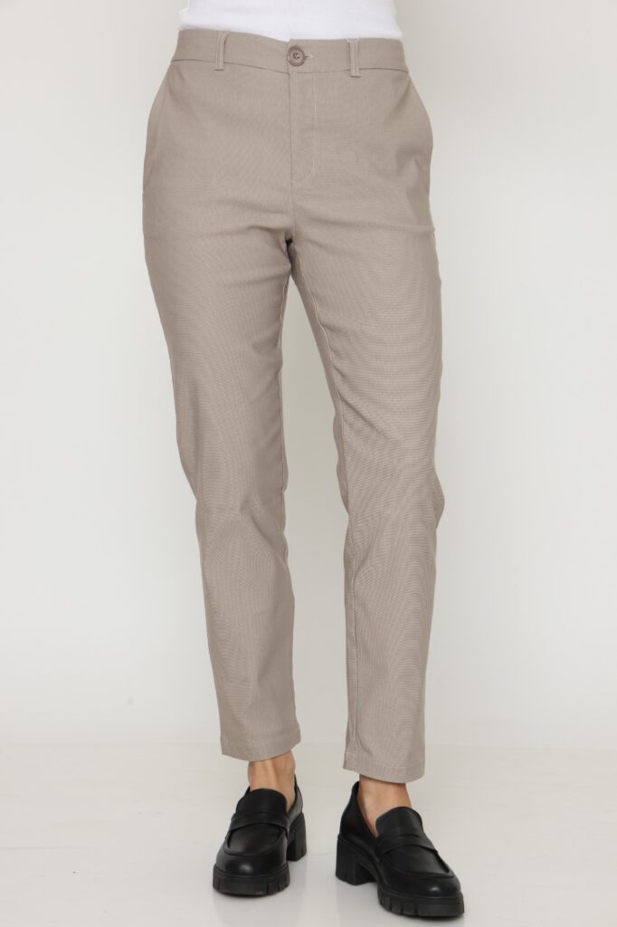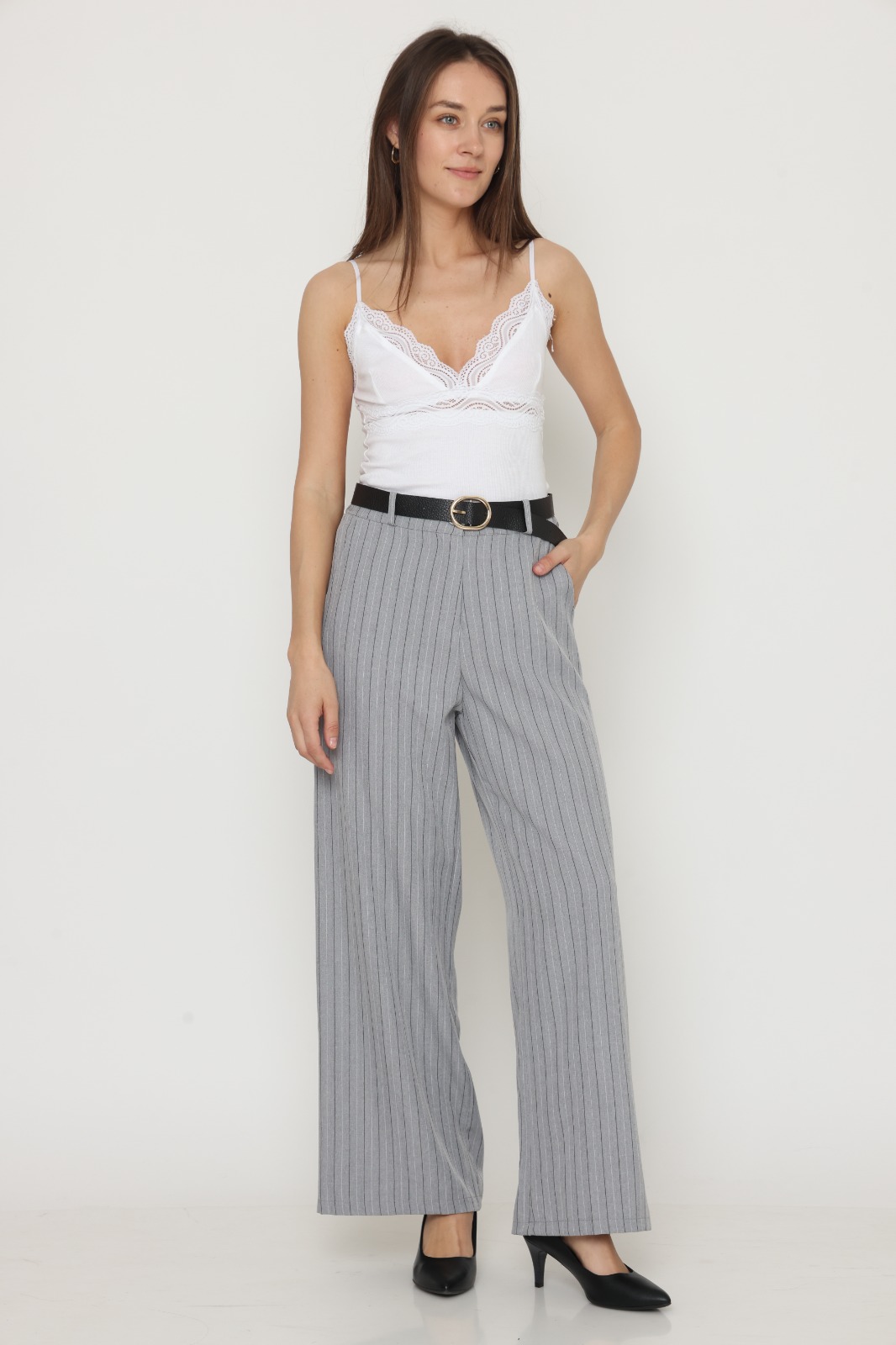 מכנס בל בגזרה ישרה, בד מחוייט בדוגמת פסים. שני כיסים קדמיים, גומי במותן האחורית וחגורה שחורה. הרכב בד: 51% ויסקוזה 46% פוליאסטר 3% אלסטן.